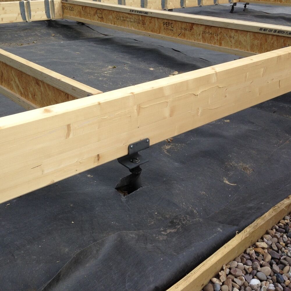 You'd simply create your decking framework and position where required. Drive the anchor down into position. We generally recommend our 50 x 10 threaded head anchor range with length according to load chart. These are impact in anchors and do not screw in, they drive down into position on their own helix. Having placed your framework, using the joist fixing bracket the (SA342) as a template to identify the correct position for you anchor, install the anchor. Simply position the bracket over the threaded anchor head and screw into position. Attach the bracket to your framework and you're done.