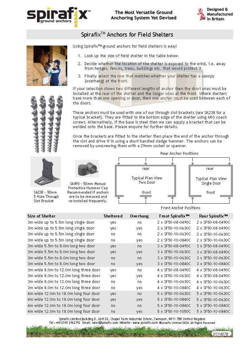 Most field shelters are made of wood which can be easily moved throughout the year. Spirafix Ground Anchors have the solution - 4 solid head anchors and 4 through slot brackets. Easy to transport, easy to use, easy to remove and therefore fully reusable, our field shelter secure anchoring solution has continued to prove very successful year after year.