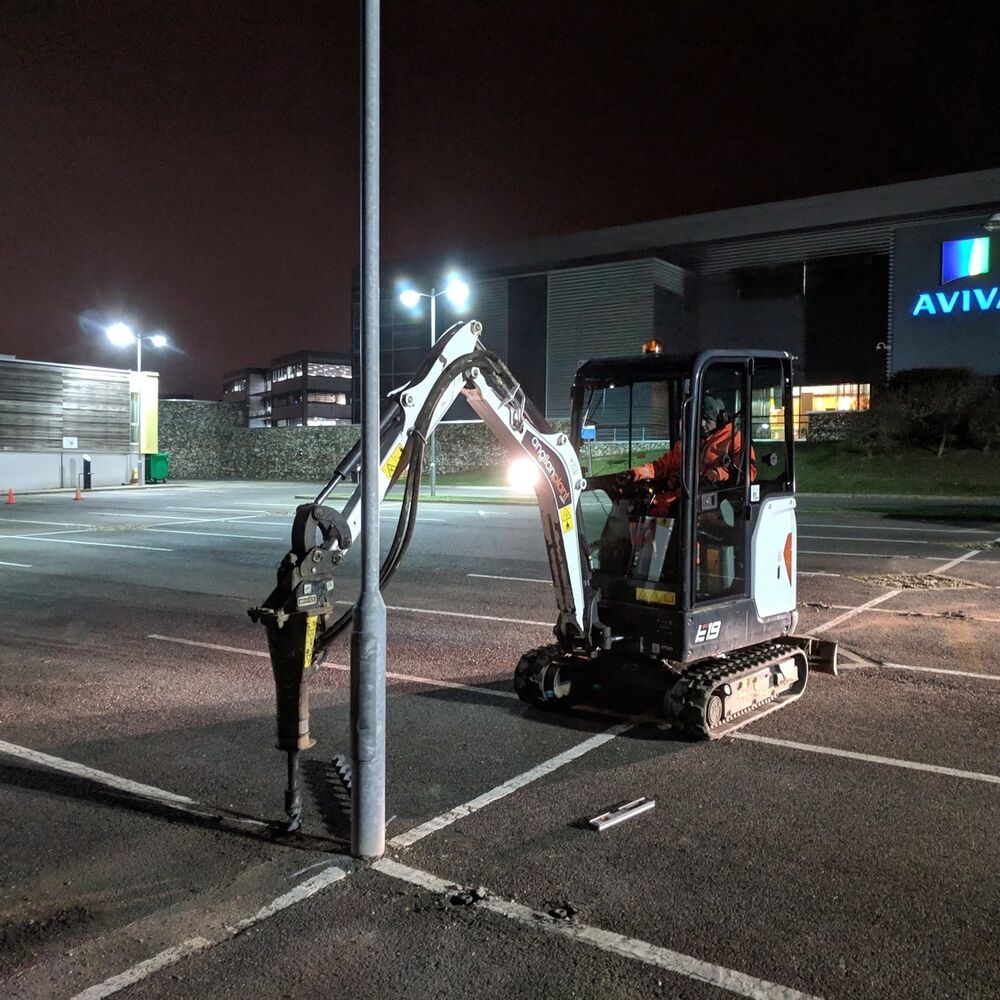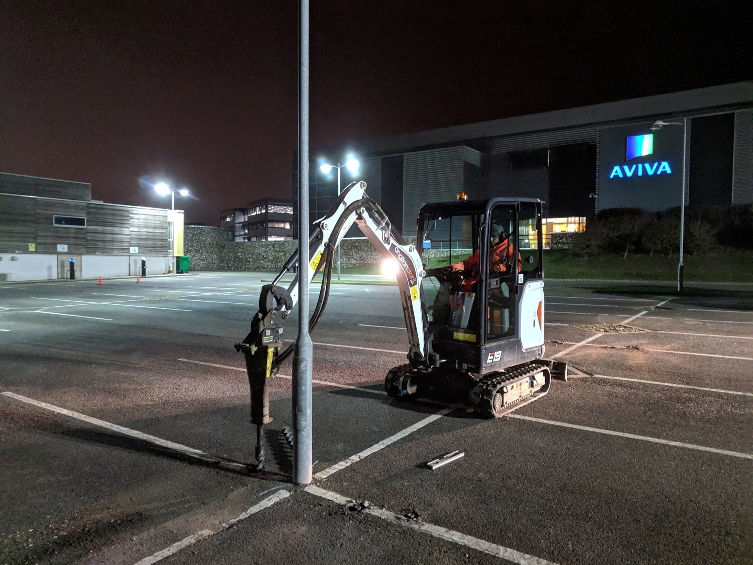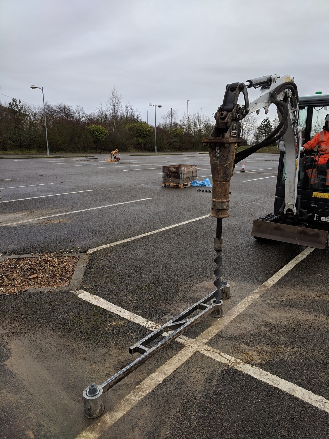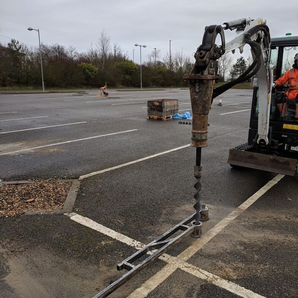 Installation of the anchors is impact driven, previously we have used a mini digger and pecker for large anchor installs in harder ground conditions, however we now have a Spirafix installation piling rig, which makes light work of these installs.