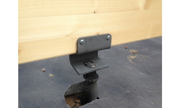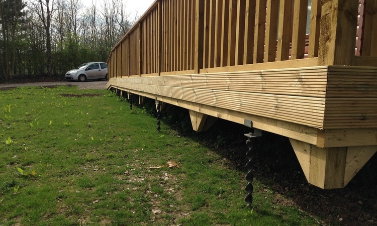 Install anchors using laser measurer/leveller for pinpoint accuracy. Anchors are installed using impact only, the helical anchors twist down into position on their own helix. Attach joist bracket to anchor. Build wooden platform/decking.