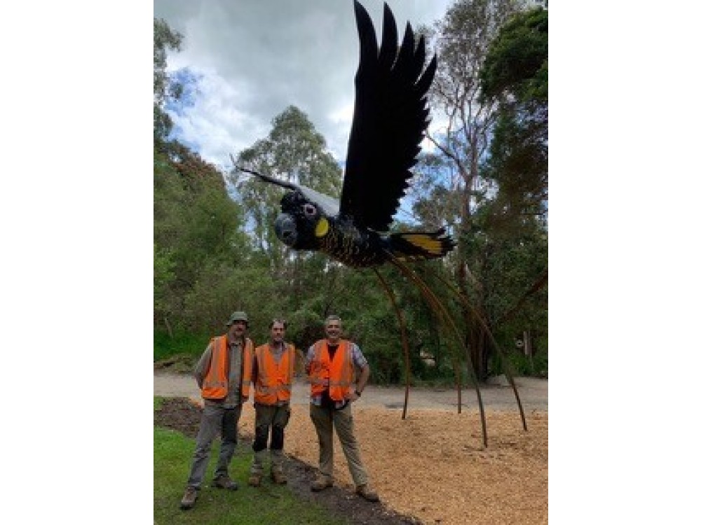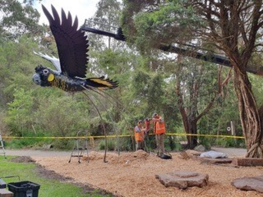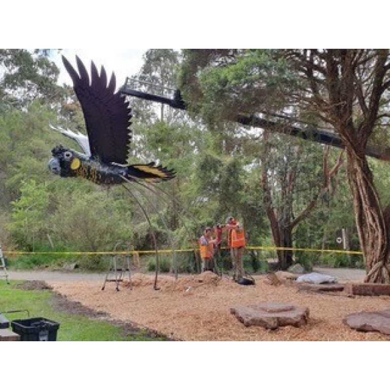 Spirafix supplied the anchors (SF50-10-1050C and SA752 quick release scaffold brackets) once soil types were determined and the anchoring required was calculated, staff on site at the Sanctuary were able to seamlessly install the sculpture. Soil was removed and the anchors were attached to a pipe frame at the base of the sculpture and driven in, soft fall was then used to build up the area around the Cockatoo.