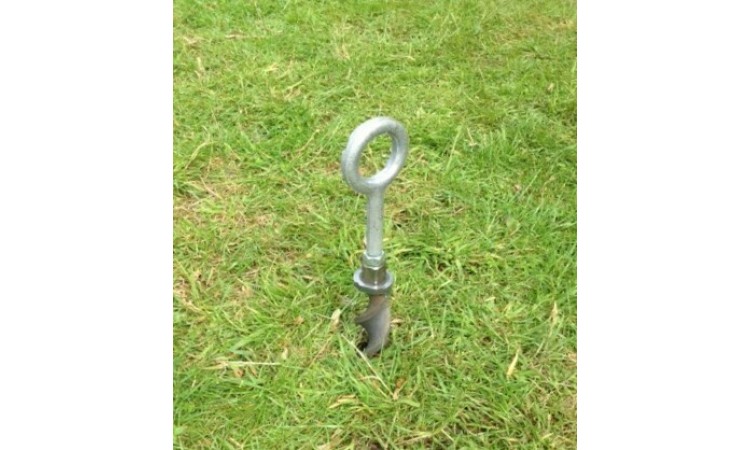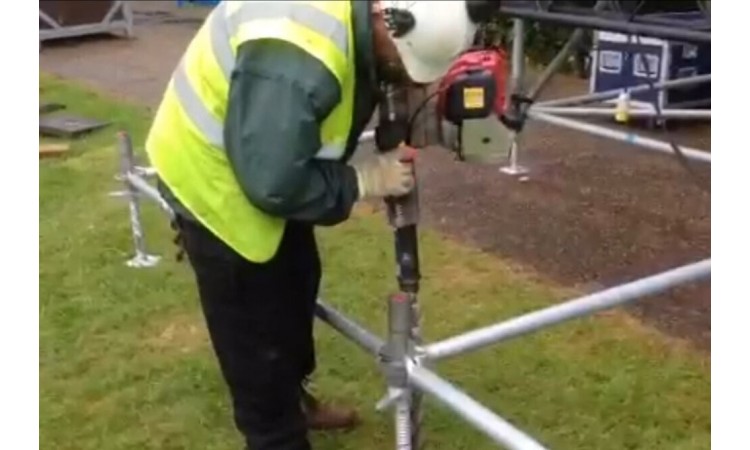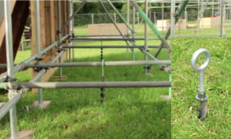 Using the SF50-10-0630AC threaded head Spirafix Ground Anchor together with scaffold ring bolts the wind loads were met and exceeded. The spiral anchors were installed and, once in position, the scaffold ring bolts were screwed into the top of the anchor. Scaffold tube was then threaded through the scaffold ring bolts to be used as the secure base for the structure.