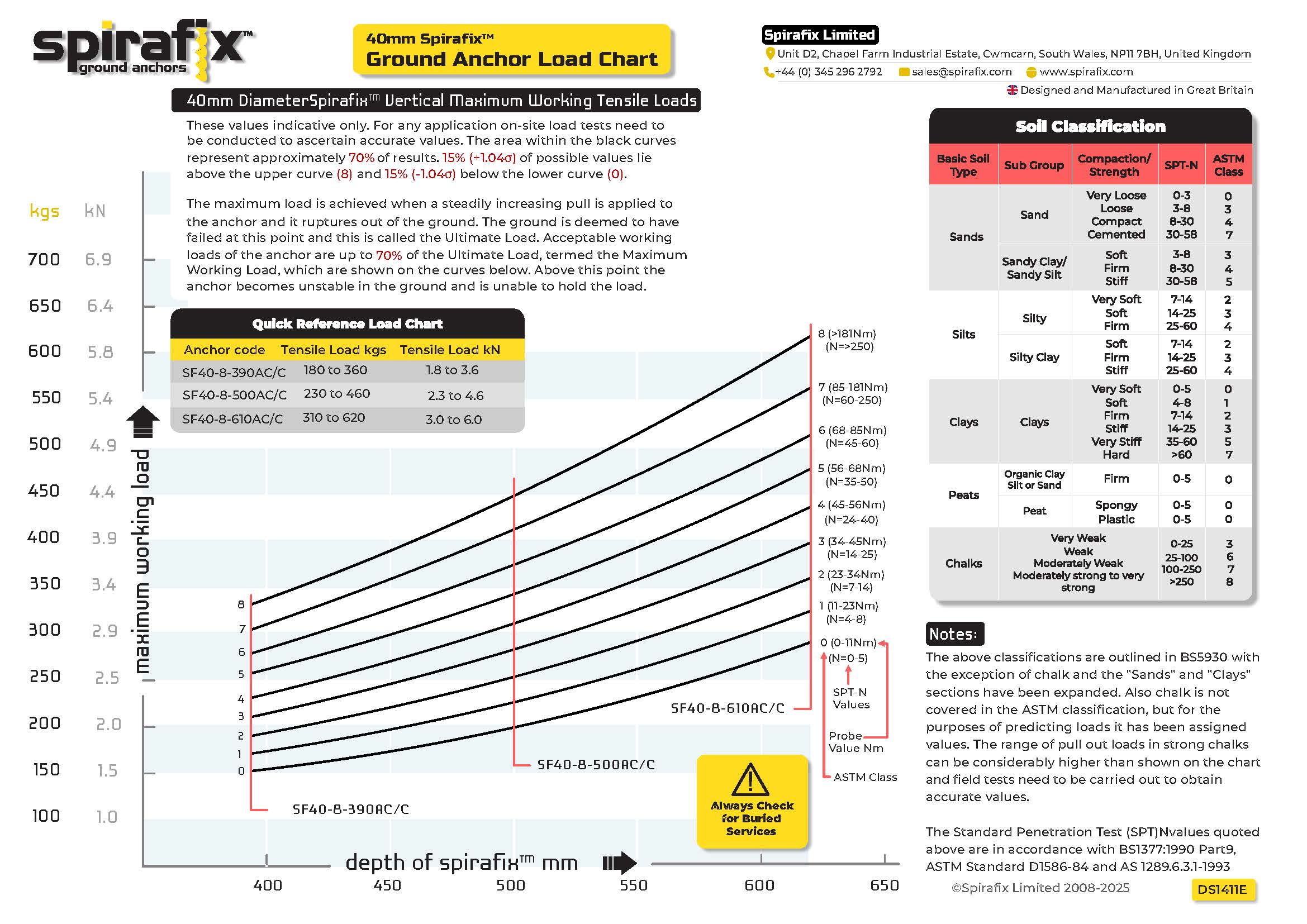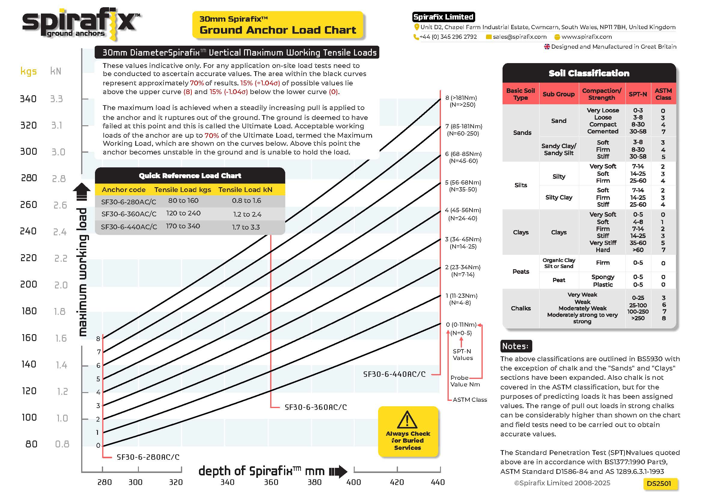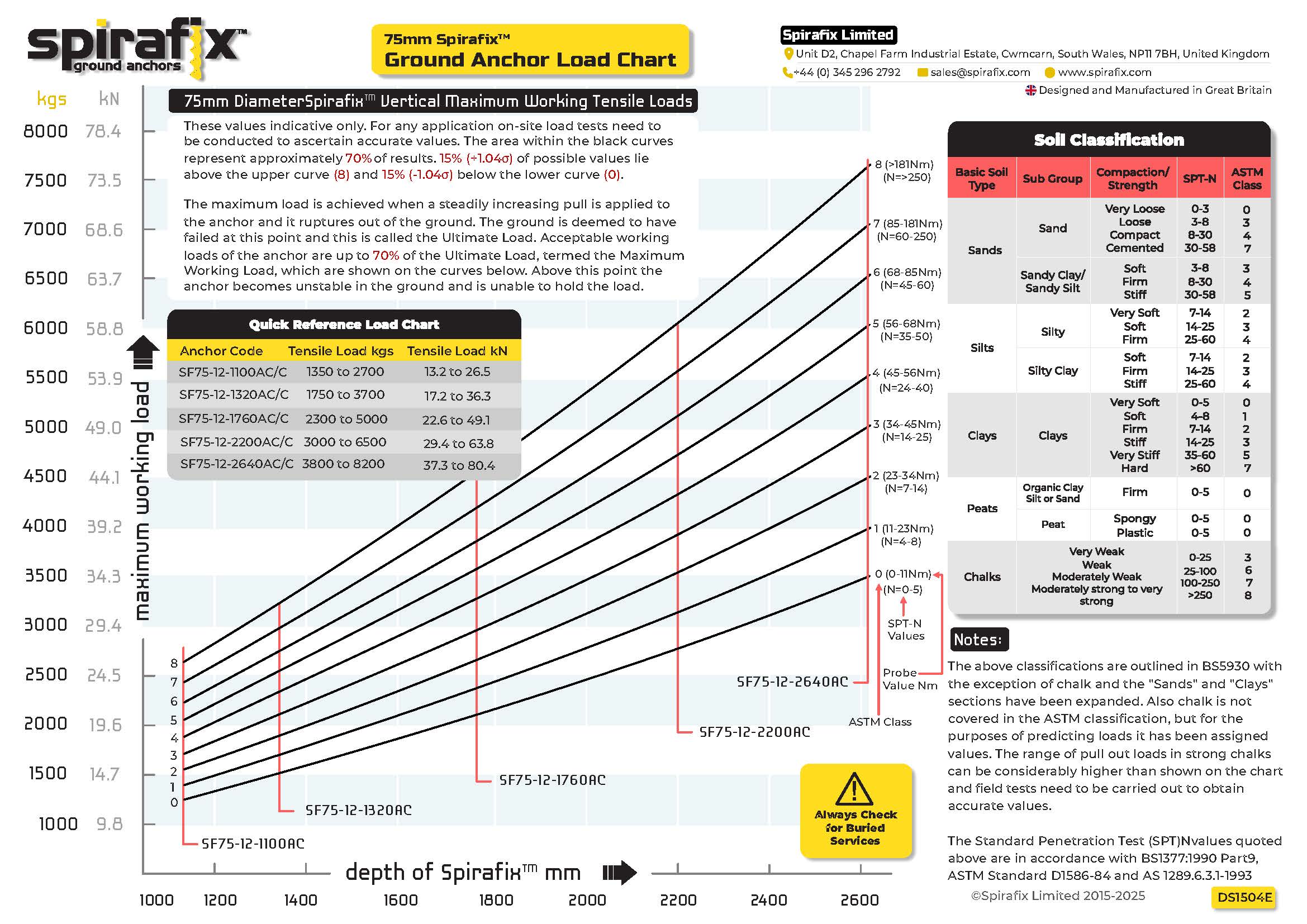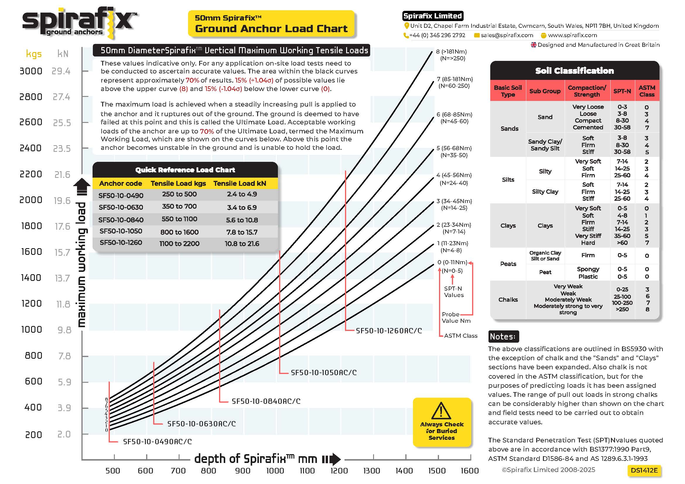 It is strongly recommended that site tests are carried out to determine the capability of local ground conditions. We can either provide you with this service or sell suitable test equipment that consists of a tripod, threaded bar, 1000kg or 5000kg load cell and all sundry items required for establishing SpirafixTM load requirements.